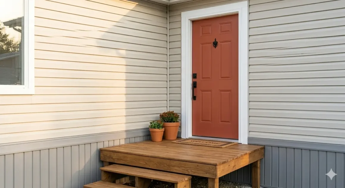 Mobile home exterior doors are non-standard sizes (often 32×76 inches), making replacement costly. Painting the existing door is far cheaper and surprisingly impactful. Deep navy, forest green, and terra cotta are all trending accent colours that dramatically increase curb appeal. Use exterior-grade enamel paint for UV resistance, and replace the door hardware and knocker while you’re at it for a complete look under $100.